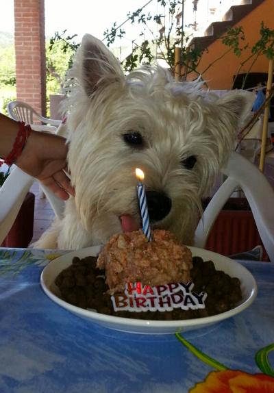 Amici, eccomi qui nel mio splendore di 1 anno di felice vita canina. Sveglia x le 8, strapazzato di coccole dalla mamy, un pò di prosciuttino cotto a colazione ( solo oggi, sigh), passeggiata fra i castagni della toscana, caldino ma c'è il vento che mi piace un sacco. Poi festicciola di compleanno, la mamy e il fratellino non peloso, hanno fatto una tortina con la mia pappa ( che prontamente ho sbafato), poi siesta con la mia ciotola dell'acqua, i giochini regalati e un bel biscottone x cani a forma d'osso super succulento...ora mi spaparanzo al fresco e poi chissà... stasera magari mi portano a ballare! :-)